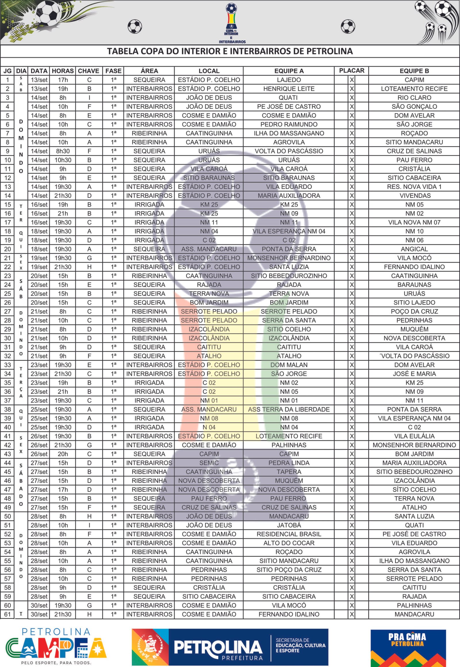 A Copa do Interior e o Campeonato Interbairros contam com organização da Prefeitura de Petrolina, através da Secretaria de Educação, Cultura e Esporte, e têm como objetivo fortalecer o esporte amador, promover integração entre bairros e comunidades e revelar novos talentos do futebol local.